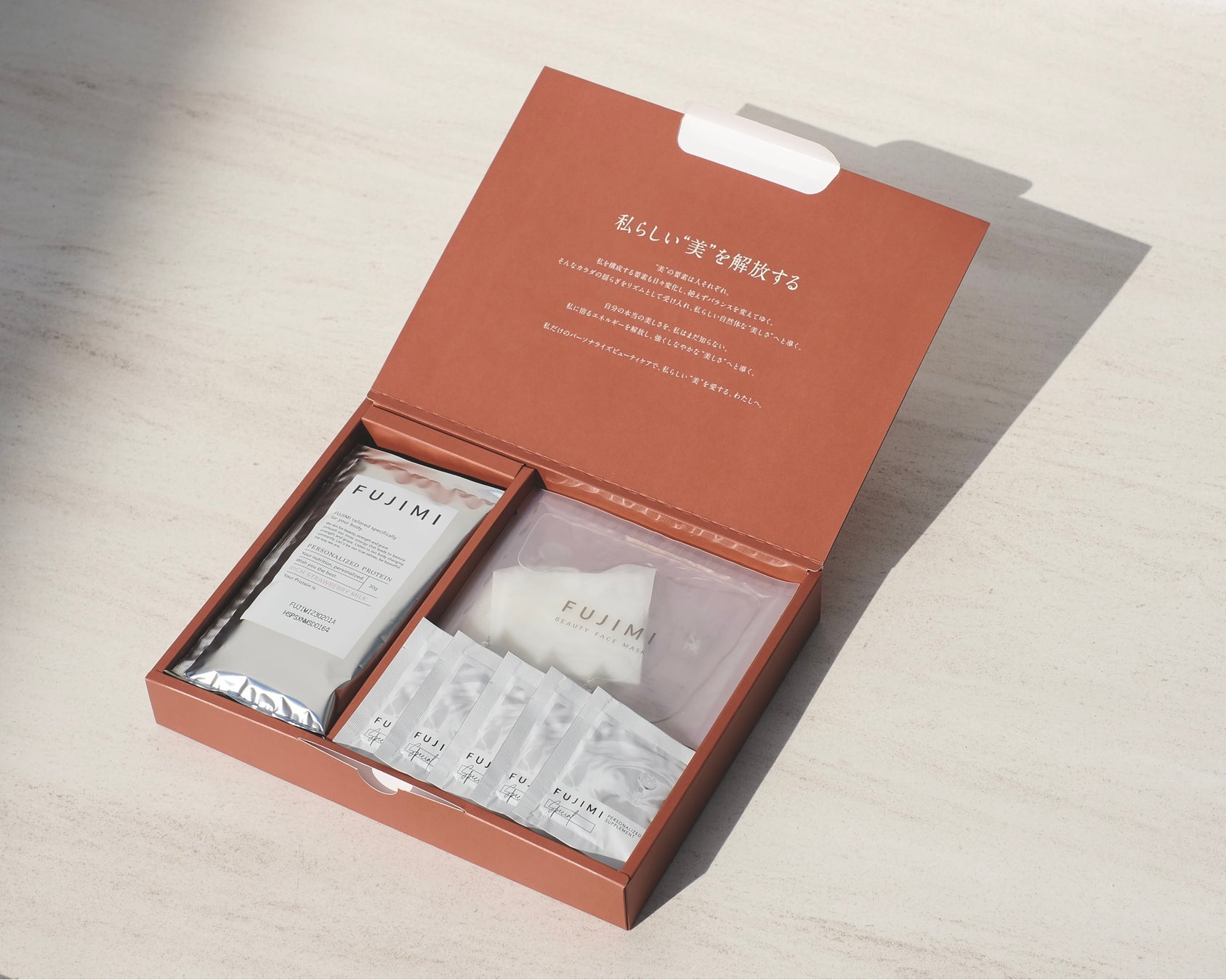 FUJIMIは「私らしい美しさで、私をもっと好きになる」がコンセプトの、美容分析からつくるパーソナライズビューティケアです。 約30問の美容に関する設問にお答えいただき、その分析結果からあなたに合わせてパーソナライズし、FUJIMIオリジナルのサプリメントやフェイスマスク、プロテインをご自宅までお届けいたします。