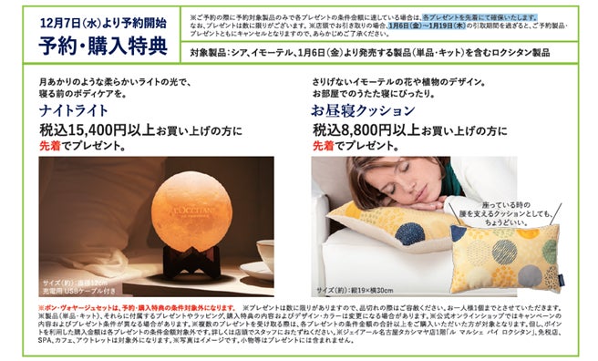 に「ナイトライト」を、税込8,800円以上お買い上げの方には「お昼寝クッション」を先着でプレゼントいたします。プレゼントの対象製品など詳細はロクシタン公式通販サイトなどでご確認ください。