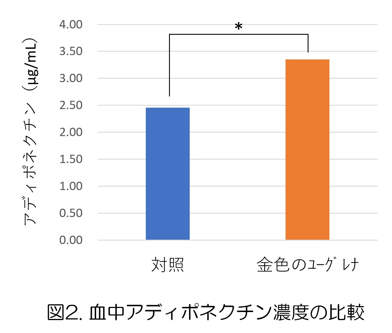 • 血中のアディポネクチンにおいて、金色のユーグレナ群は対照群と比較して、有意な低下抑制が確認された(図2)。