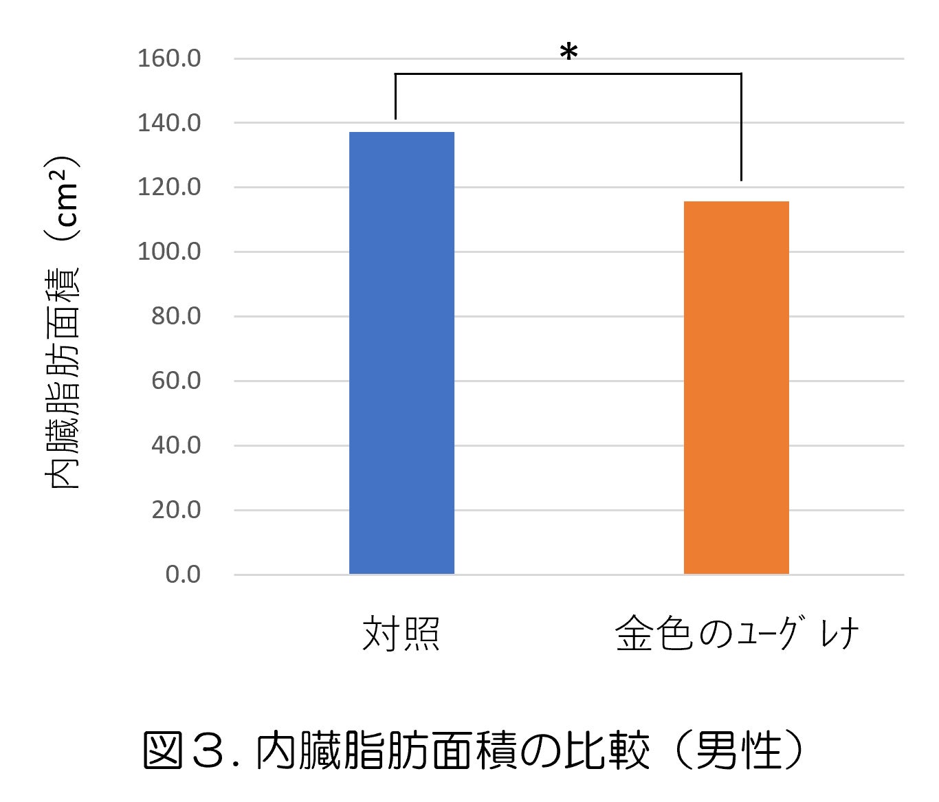• 男性の比較においては、金色のユーグレナ群は対照群と比較して、内臓脂肪面積の有意な低下が確認された(図3、4)。