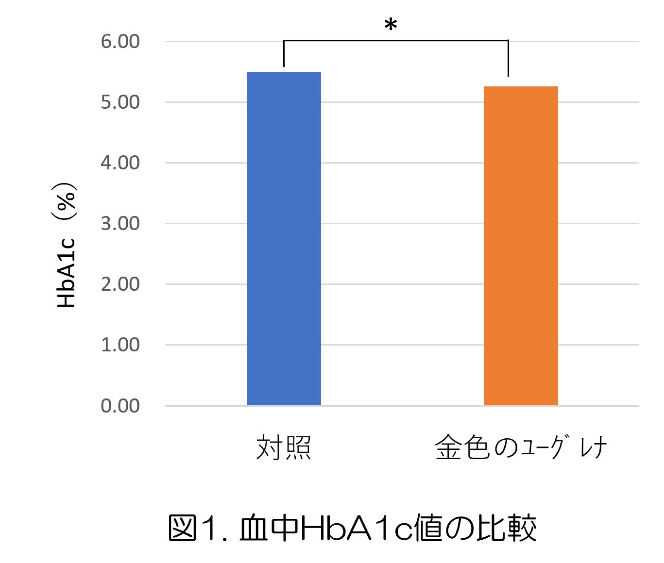 • 血中のHbA1cにおいて、金色のユーグレナ群は対照群と比較して、有意な改善が確認された(図1)。