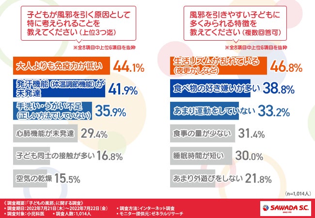 子どもが風邪を引く原因は、大人よりも免疫力が低いことや発汗機能(体温調節機能)が未発達なことと考えている医師が多いことが分かりました。