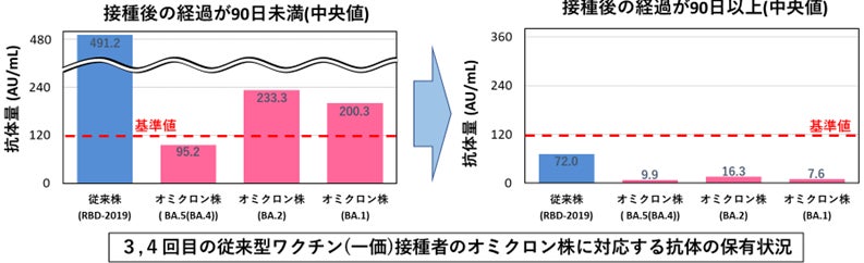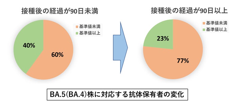 3、4回目の従来型ワクチン(一価)接種のみにおいて、オミクロンBA.5(BA.4)株に対する抗体の抗体量(抗体価)が基準値未満になる方の割合が、ワクチン接種後90日未満でも60%と高い値を示しました。さらに、その割合が、接種後90日以上経過した方では77%へと増加しました。