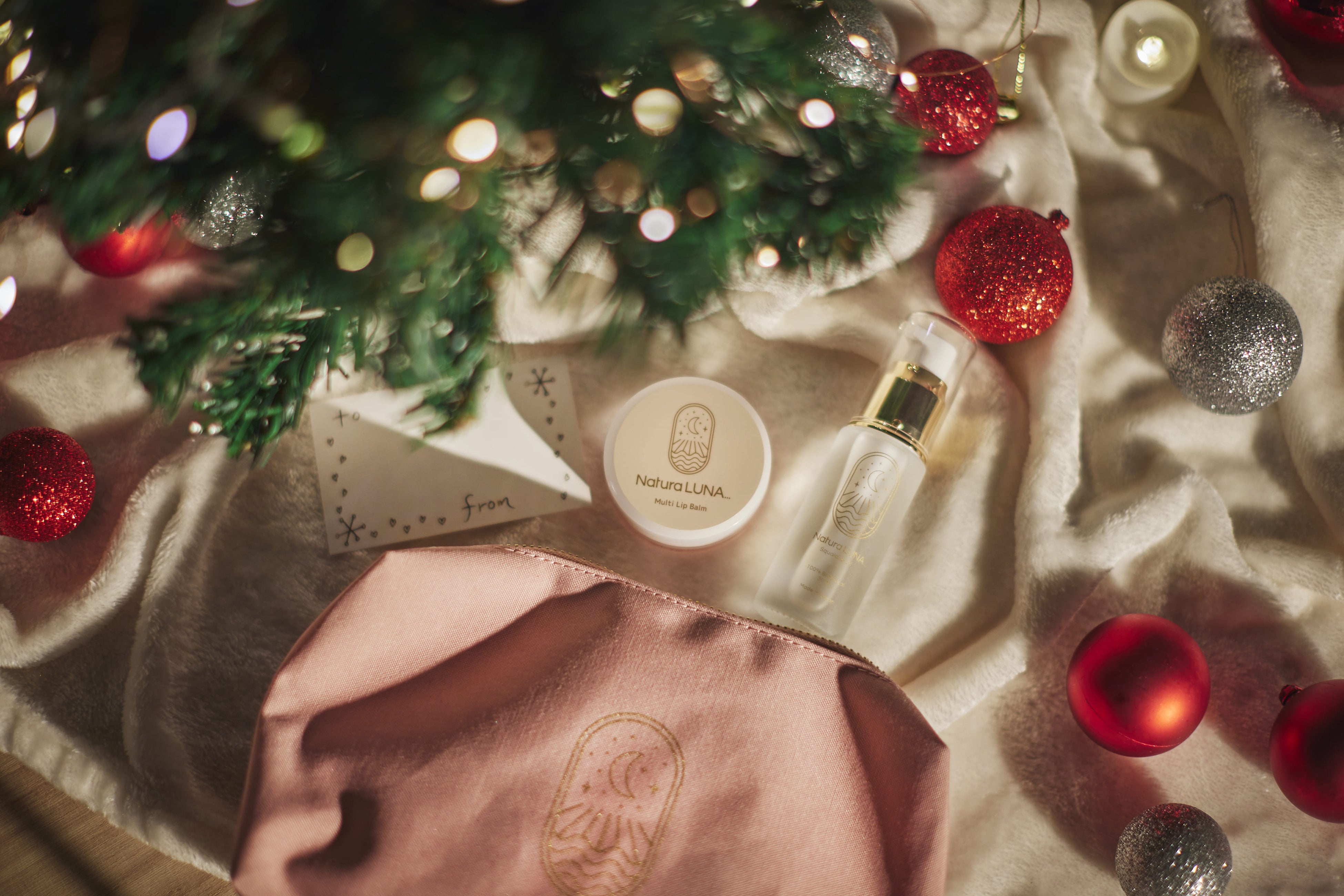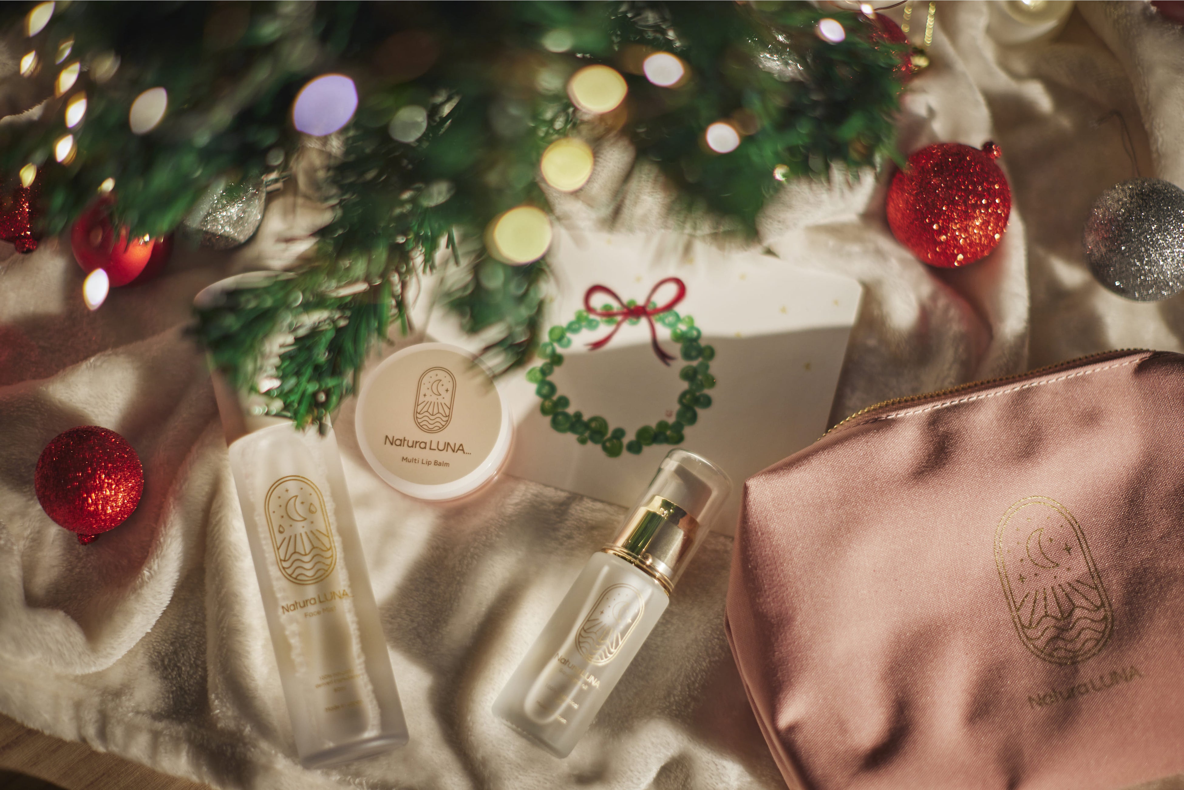クリスマスコフレ限定のオリジナルポーチです。NaturaLUNA…のスクワランオイル、フェイスミスト、マルチリップバームが入る大容量サイズ!