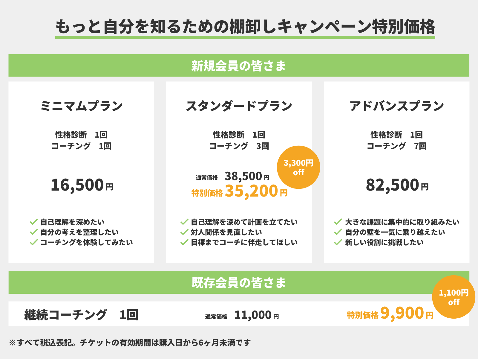 アセスメントコーチングが普段よりもお得な料金でご利用いただけますので、ぜひご利用ください。