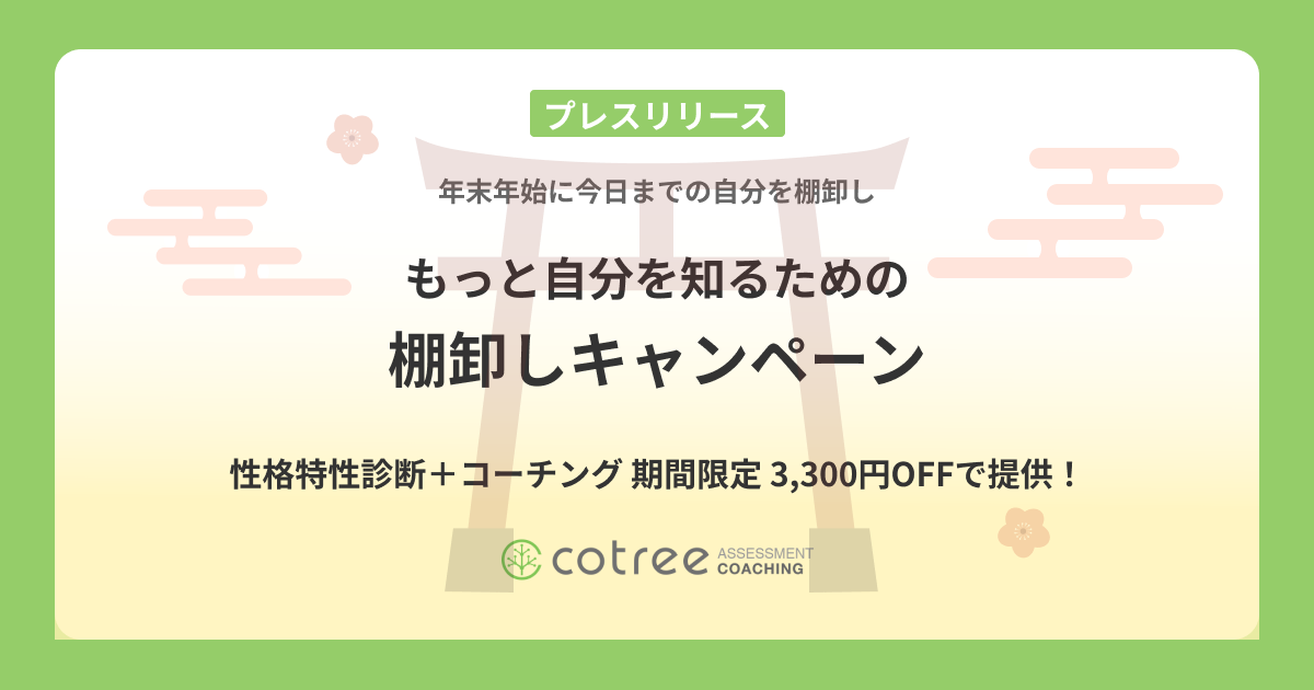株式会社cotree(本社:東京都港区、代表取締役:西岡 恵子、以下cotree)は、2022年12月8日(木)から1月31日(火)までcotreeのアセスメントコーチングを特別価格でご提供する「もっと自分を知るための棚卸しキャンペーン」を開催することをお知らせいたします。