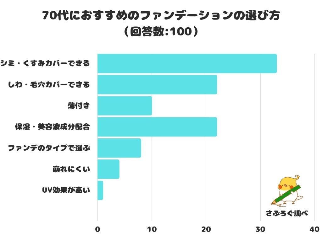 70代におすすめのファンデーションの選び方をアンケートにて調査したところ、1位は「シミ・くすみカバーできる」でした。
