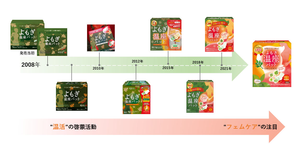 よもぎ温座パットの誕生は、社内のアイディアコンペで「韓国にこんな商品がある」とインターン生が紹介したのがきっかけ。女性の社会進出が叫ばれ、就業率が60%を突破した頃。女性の体への負担は明らかで、こういったセルフケア商品は日本でも受け入れられるはず、すぐに作ろう!となりました。日本の法律に準拠した商品開発、販売先など、思考錯誤…。製造の過程では担当が韓国に泊まり込み、何とか商品化にこぎつけました。これまでにはなかったカテゴリ商品のため、販売営業では苦戦したものの、販売後は累計出荷数1800 万個を突破する人気商品に。