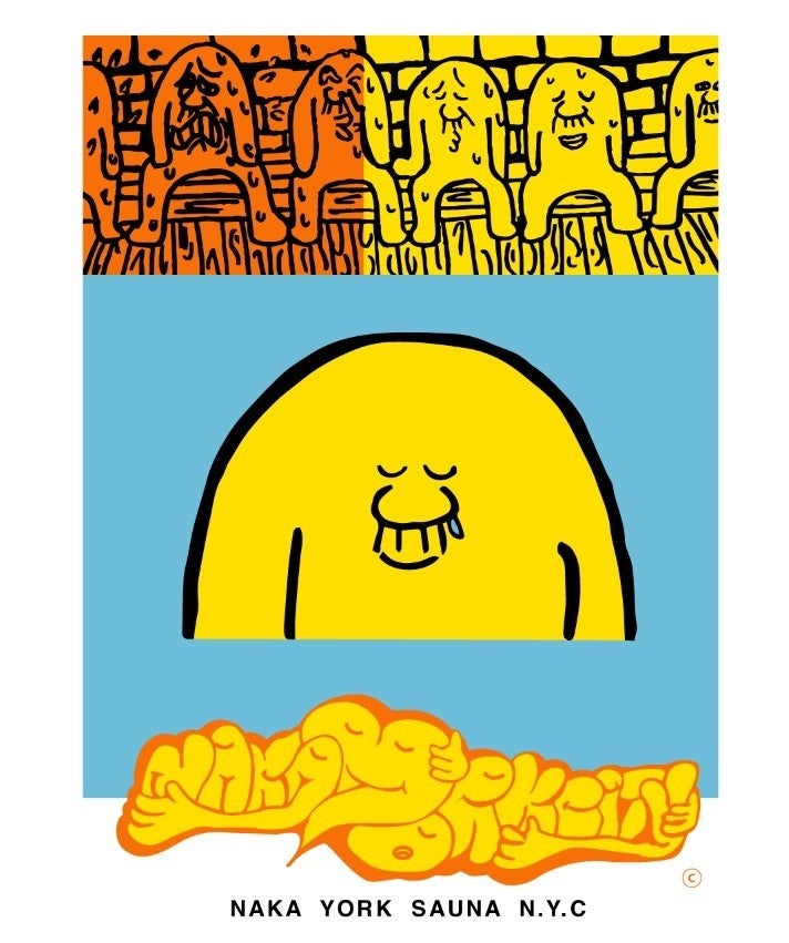 NAKA YORK CITY のマスコットキャライゴちゃんがサウナに入り、水風呂でトトノウまでをイラストレイションしたデザイン。限界に向き合ったご褒美を水風呂の表情で「トトノウ」を表現しています。