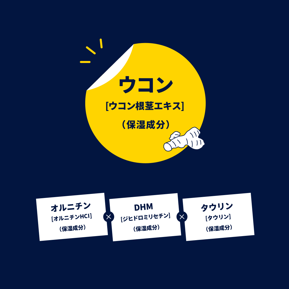 (※1 ウコン根茎エキス:保湿成分、※2オルニチンHCl:保湿成分、※3ジヒドロミリセチン:保湿成分、※4オオアザミ種子エキス:保湿成分、※5テトラヘキシルデカン酸アスコルビル:保湿成分)