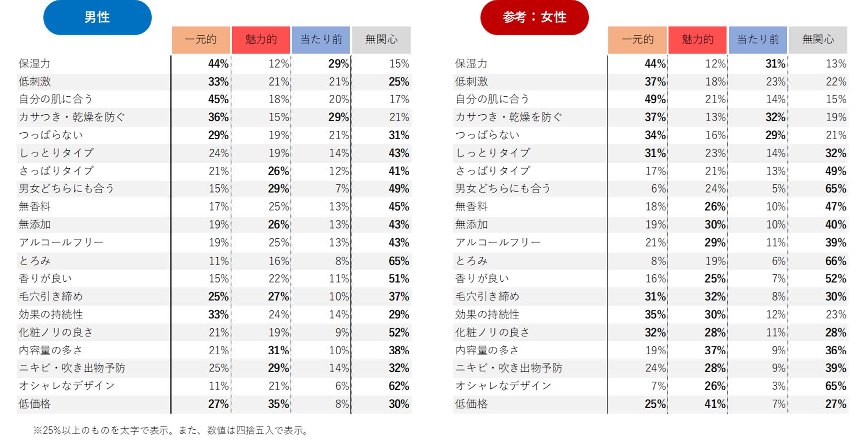 男性が化粧水に求める特性について、魅力品質は「低価格」「内容量の多さ」「男女兼用」「ニキビ・吹き出物予防」「毛穴引き締め」など、一元的品質は「自分の肌に合う」「保湿力」「カサつき・乾燥を防ぐ」など、当たり前品質は「保湿力」「カサつき・乾燥を防ぐ」、無関心品質は「とろみ」「オシャレなデザイン」「化粧ノリの良さ」などであった。保湿・乾燥防止などは、未充足だと不満につながる基本的な品質であるため訴求力は弱く、副次的な品質(≒機能)やコストパフォーマンスによる市場開拓が有効だと考えられる。