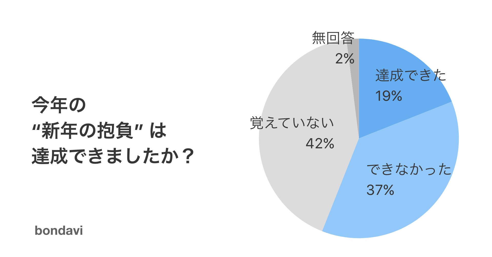 昨年実施のアンケート結果「新年の目標を達成できる人は20%もいない」と合わせて、「(新年こそ特に)結果を焦らず現実的な目標を立てることの重要性」が裏付けられました。
