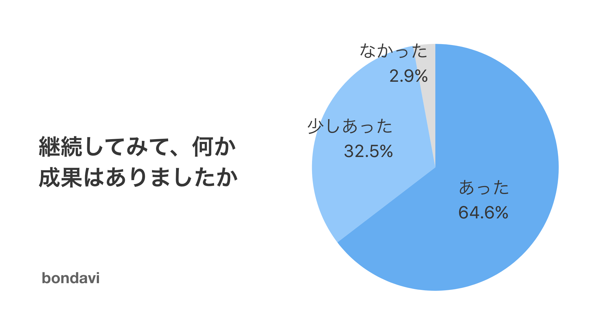 bondavi株式会社(神奈川県横浜市)は、「結果を焦らず、小さな目標をコツコツ継続した人」についてアンケート調査を実施しました。対象は、習慣化アプリ「継続する技術」で「1日5分でできる目標 (筋トレ・読書など) 」を6ヶ月以上継続したユーザー。
