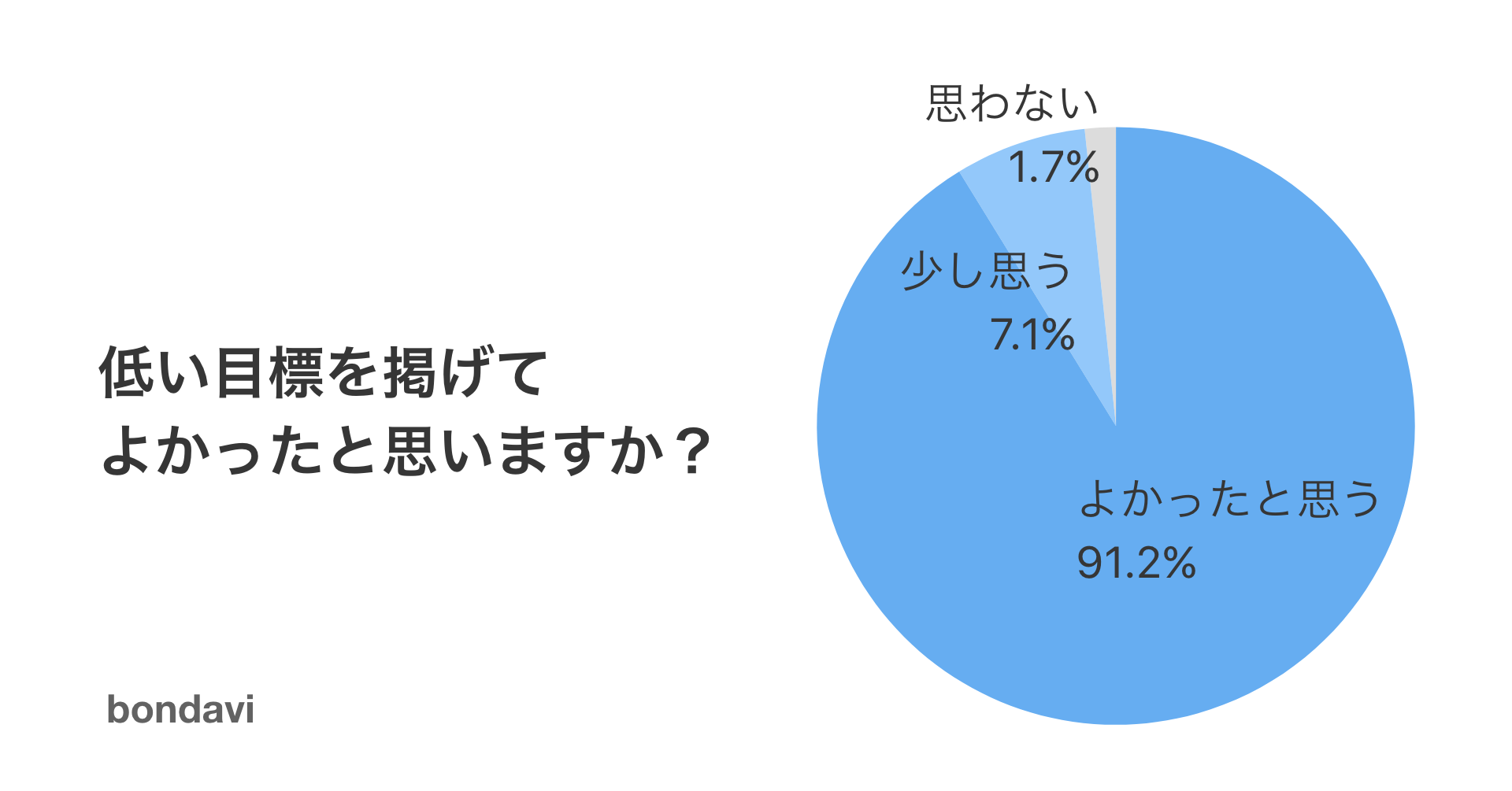 A. 98%以上が、低い目標を掲げてよかったと回答しました。