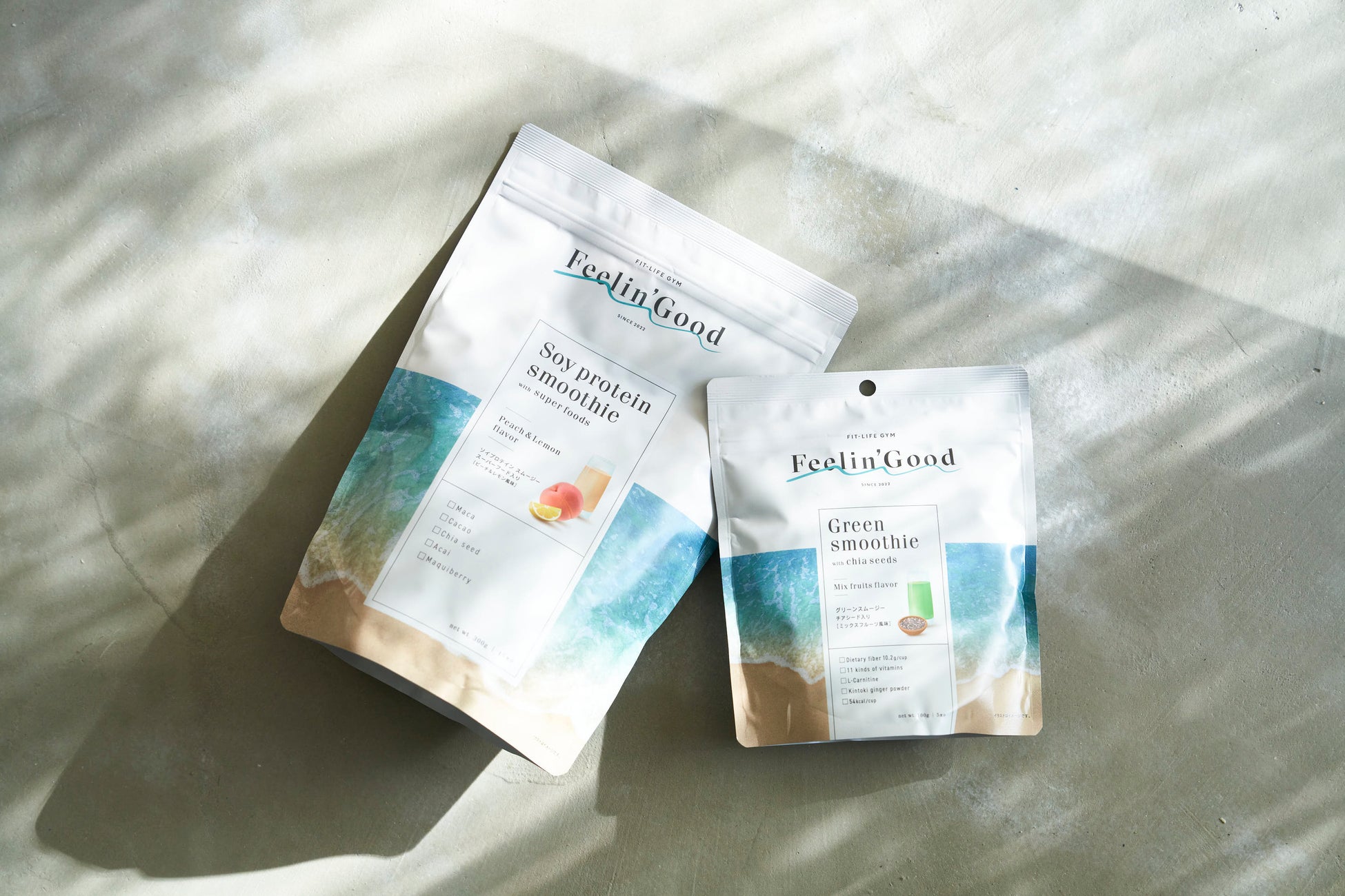 ジムオープンにあたり、株式会社ファインのFeelin’Goodオリジナルスポーツドリンク、スムージーを販売します。
