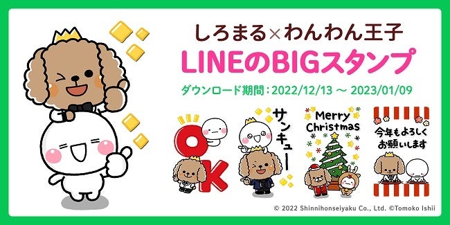 幅広い世代に人気の白くて愛らしい見た目のキャラクター「しろまる」と、パーフェクトワン公式キャラクターの美肌の国生まれでキザな王子「わんわん王子」とのコラボLINEスタンプを2022年12月13日(火)〜2023年1月9日(月)まで無料配信します。第2弾となる今回は、通常のLINEスタンプよりもトークルームで縦に大きく表示される「BIGスタンプ」を配信します。日常使いしやすいスタンプだけでなく、クリスマスや年末年始にも使用できるスタンプなど全16種類をダウンロードできます。