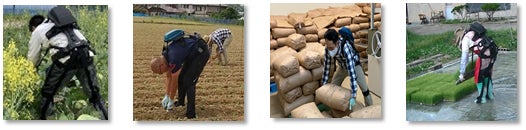 これらの特長から、土地利用型作物を中心に、腰への負荷が高い農作業において、その負担を軽減することができます。この他、屋外での使用に耐えうるよう、防水・防塵性、耐候性、一部の防疫用薬剤に対しての耐薬品性も有しています。