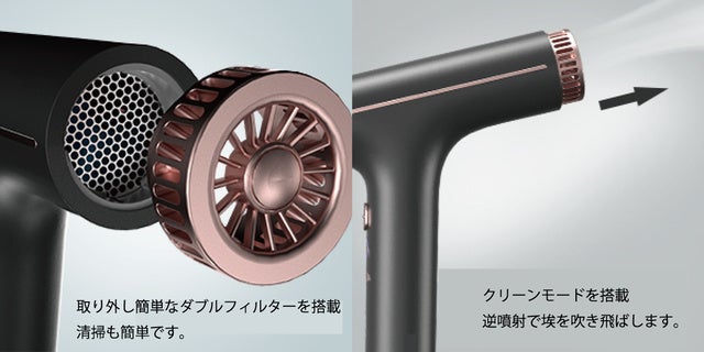 クリーン(逆噴射)モードを搭載し、フィルターを外し、さらにファンを逆回転させることで、逆噴射を行い、フィルターに溜まった埃を簡単に吹き飛ばすことが可能です