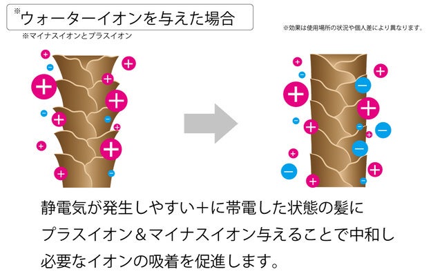 Water ion(プラスイオン&マイナスイオン)を髪に与えることで、髪の傷みの原因となる、髪に生じる静電気やキューティクル(髪の毛の表皮)へ働きかけます。