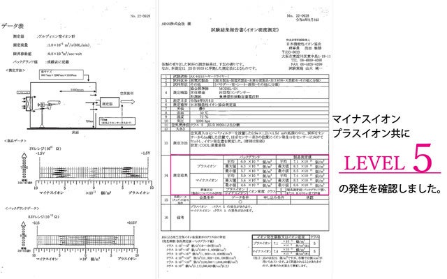 JIS規格での測定の結果、高水準のマイナスイオン、プラスイオンが発生する事が証明されました。