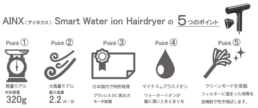 『スマートウォーターイオンヘアドライヤー』製品ページ:https://ainx.info/hairdryer
