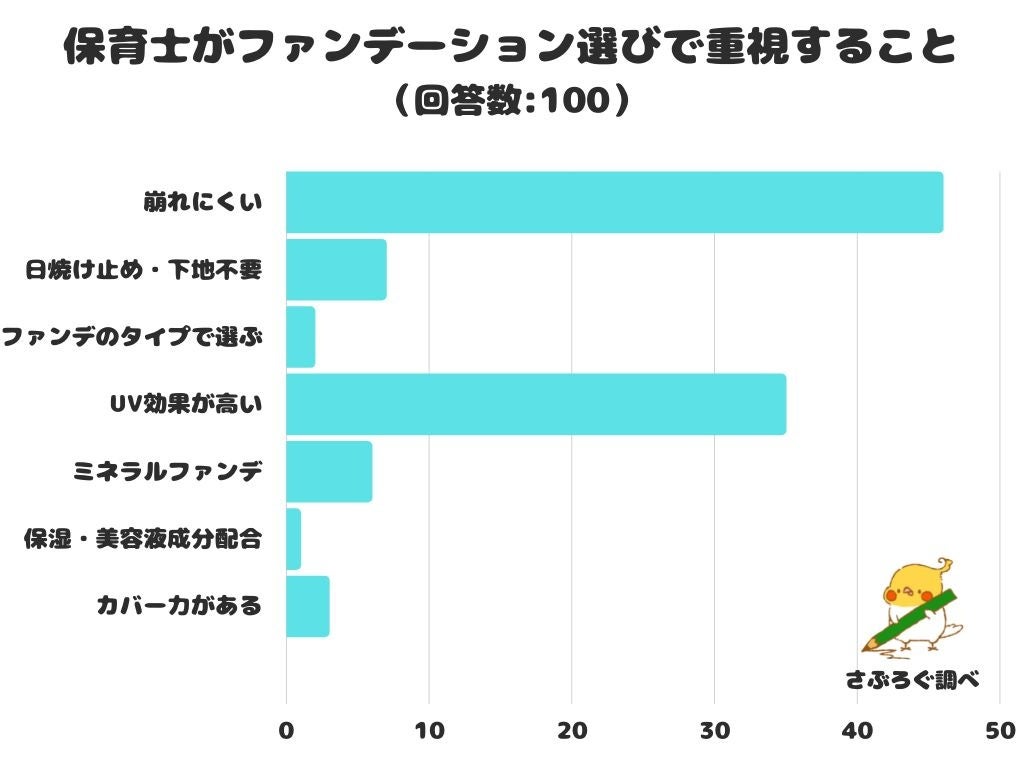 保育士がファンデーション選びで重視することをアンケートにて調査したところ、1位は「崩れにくい」でした。