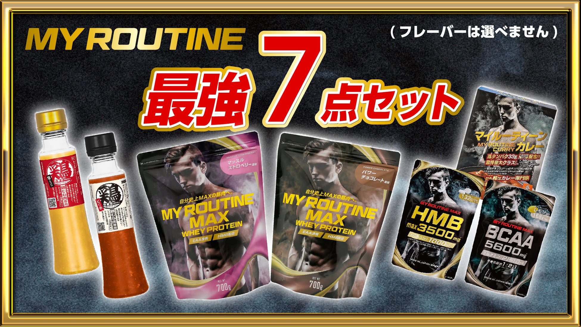 マイルーティーン MAX プロテイン700g 2袋、マイルーティーンMAX HMB3500mg 1袋、マイルーティーンMAX BCAA 1袋、マイルーティーンカレー 中辛 1個、マイルーティーン 鶏むね肉はごはんつぶ(塩こうじ味/ピリ辛こうじ味)。※プロテインのフレーバーはお選びいただけません。