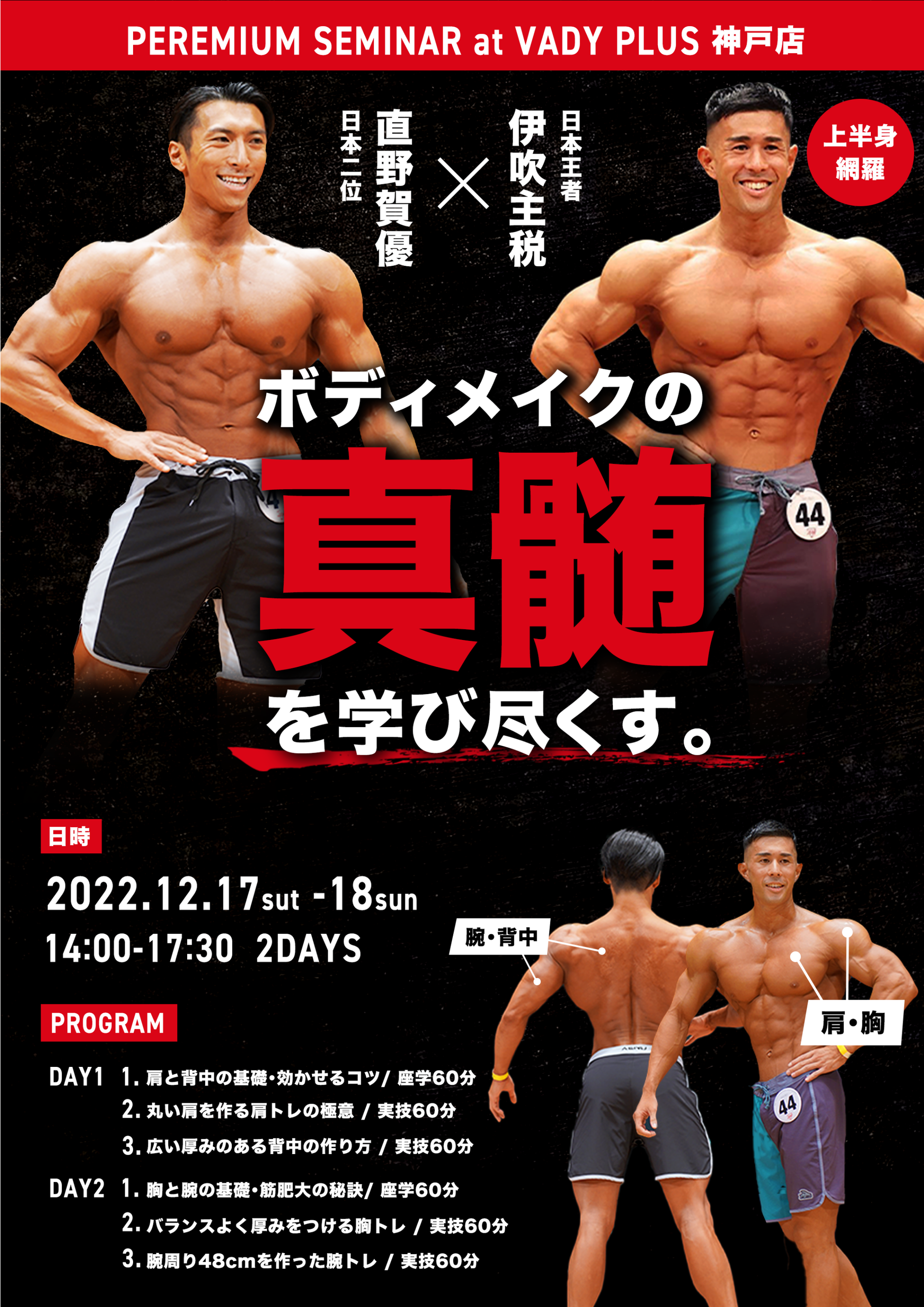 大阪・神戸を中心にパーソナルトレーニングジムを展開する株式会社VADY(本社:兵庫県神戸市)の24時間フィットネスジム「VADY+ 神戸」にて、今年のJBBFメンズフィジークで日本を制した新王者、伊吹主税(イブキチカラ)選手と日本2位の直野賀優(ナオノ ヨシマサ)選手による合同セミナーを12月17日(土)・18日(日) の2日間にわたり開催いたします。