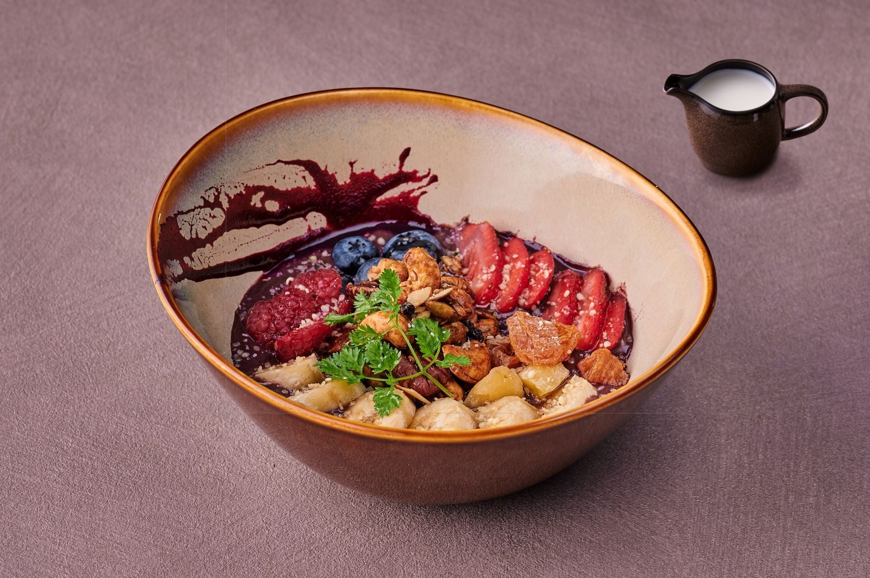La Protein ミルクティー味をブレンドしたアサイーピューレに、アマニやピーカンナッツなどを使用した自家製スーパーフードグラノーラと、ベリーやバナナ、デーツなどのフルーツをたっぷりとトッピング。
