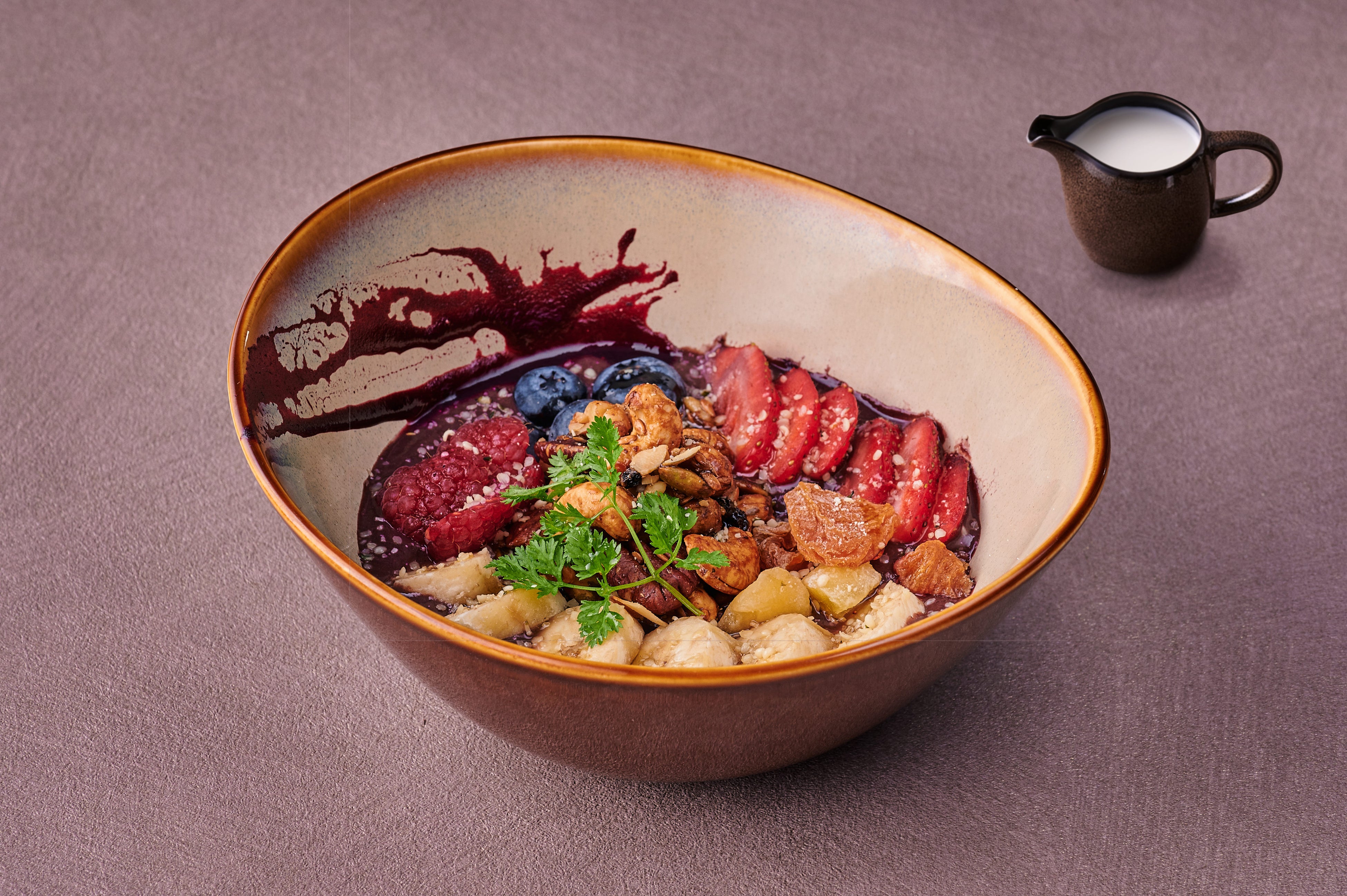 La proteinミルクティー味をブレンドしたアサイーピューレにアマニやピーカンナッツなどを使用した自家製スーパーフードグラノーラと、ベリーやバナナ、デーツなどのフルーツをたっぷりとトッピング。シナモンとカシスのアクセントが効いたヘルシーな一皿です。よりミルクティーの味をお楽しみいただけるよう、La protein ミルクティー味をアーモンドミルクで溶いた“追いプロテイン”を別添えでご用意しました。
