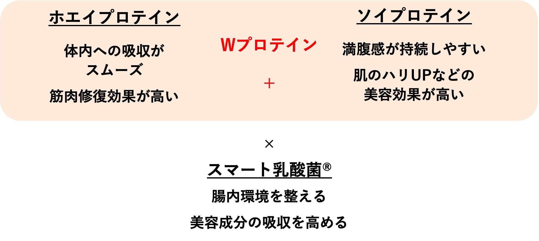 「ホエイ プロテイン」と「ソイ プロテイン」のWプロテインに加えて「スマート乳酸菌®︎」を配合。ホエイ プロテインには筋肉のエネルギー源となるアミノ酸を豊富に含有。ソイ プロテインは、イソフラボン配合で美肌と女性らしい体づくりをアシストします。