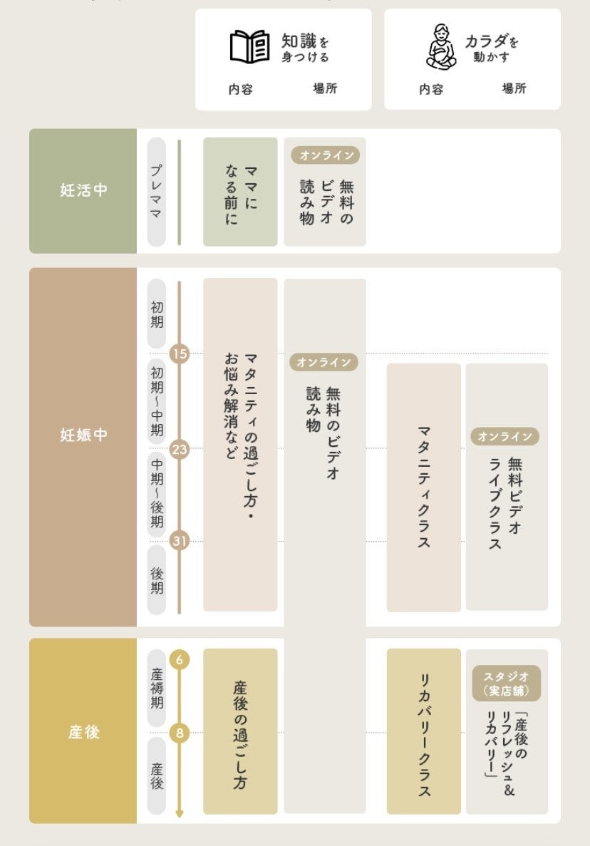 そして、プログラムの7のフェーズでは、「ビデオで学ぶ(無料)」、「記事を読む(無料)」のコンテンツに加えて、実店舗(スタジオ・ヨギー中目黒)でご提供している、熟練のヨガインストラクターと身体機能改善のプロが産後の女性の身体のために開発した専門プログラム「産後のリフレッシュ&リカバリー」(有料)がご選択・ご購入いただけます。