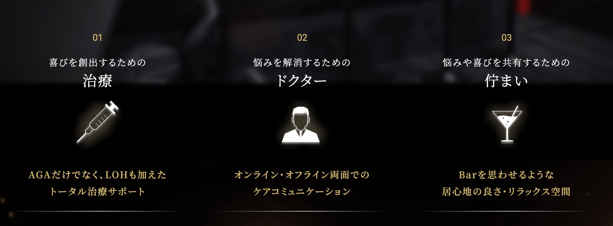 もう、このような悩みを一人で抱え続ける必要はありません。Dr.Black AGAでは、次にあげる3つのサービスを武器に、薄毛に悩みを抱える皆さまを徹底してサポートいたします。