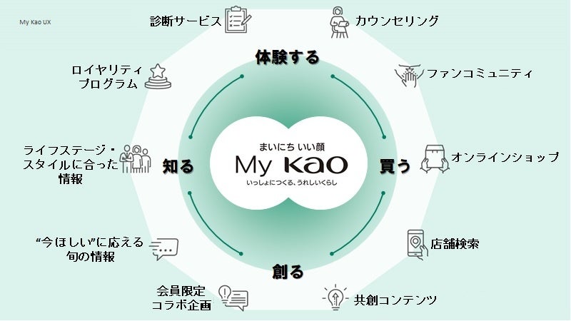 花王は、DXという手段により、これまでの“モノを作る”に留まらず、“体験を創る”ことをめざします。『My Kao』を、「多種多様な生活者に向けた幅広い体験づくり」を提供する、生活者との“体験共創プラットフォーム”として進化させ、製造業から「UX創造企業」への変革を加速させてまいります。