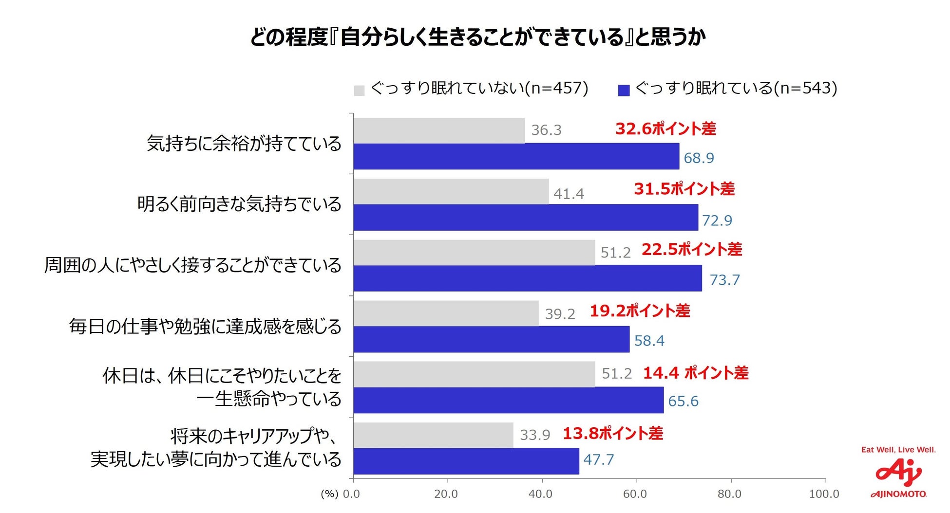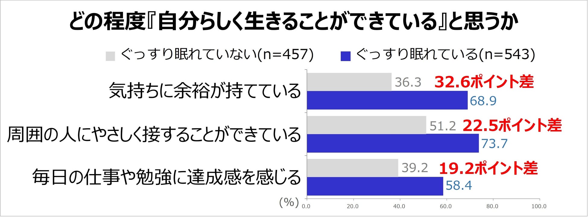 ぐっすり睡眠実感者(※1)は非実感者よりも、自分らしい生き方ができている