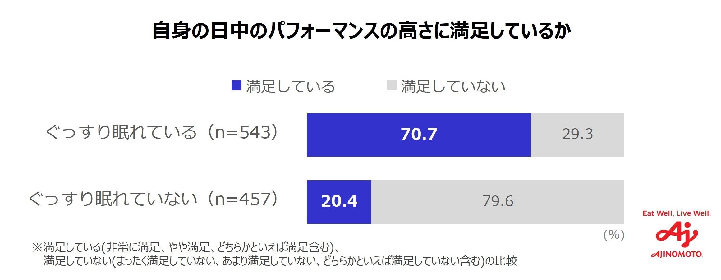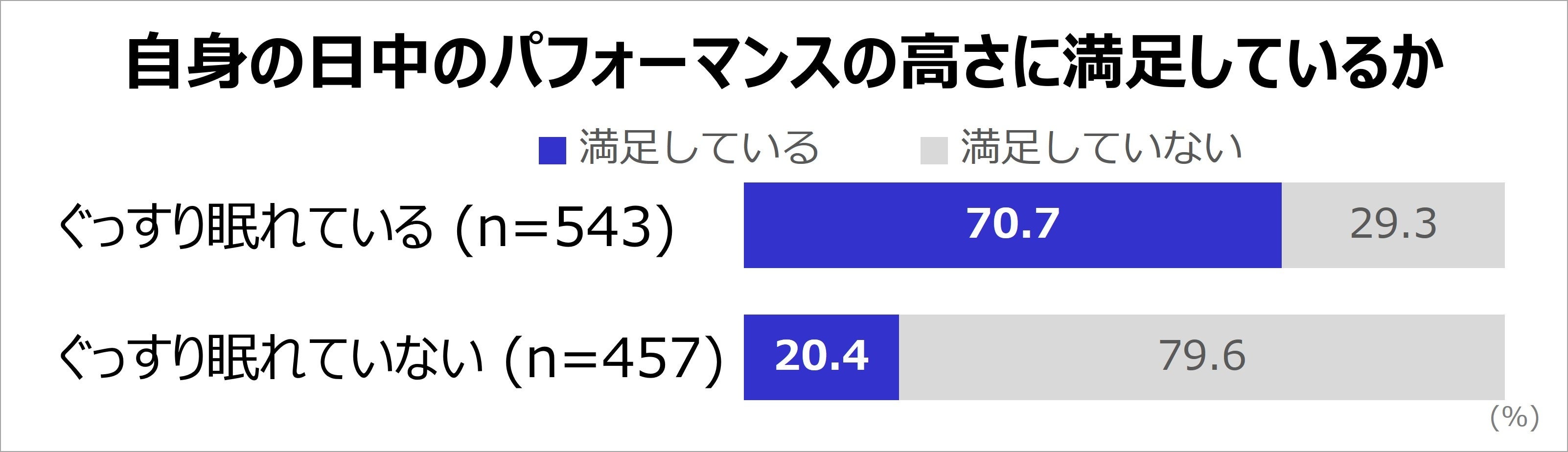 一方で、「日頃、ぐっすり眠れていない」と回答した中で、日中のパフォーマンスの高さに満足していた人はわずか2割