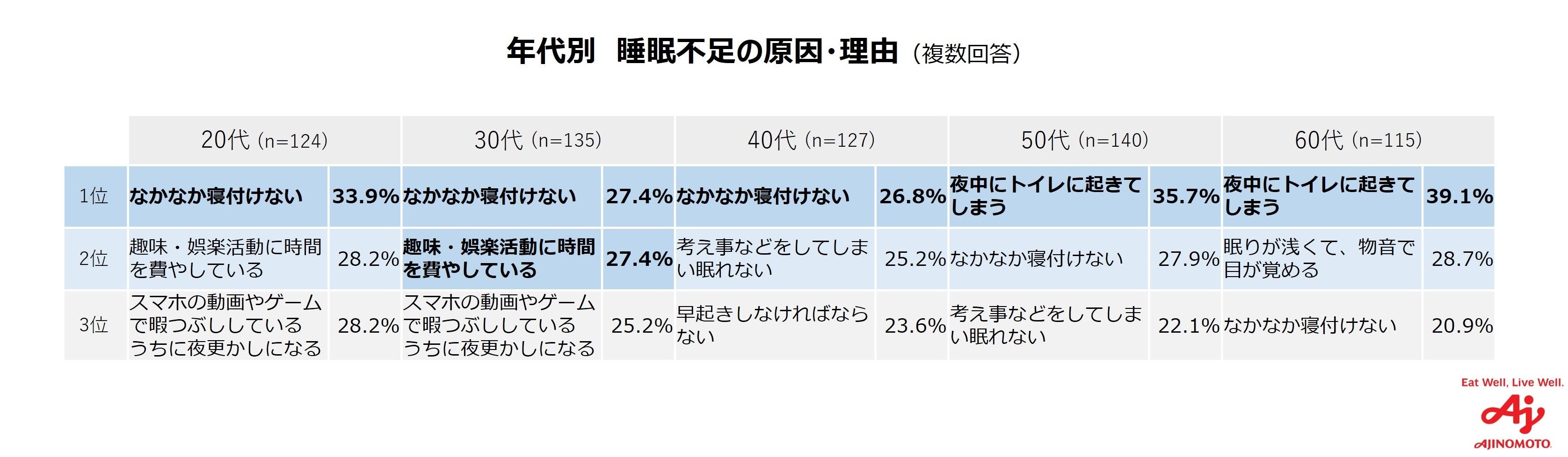 6割(64.1%)が日頃から「睡眠不足」を感じると回答し、「睡眠不足」を感じていない人の方が少ない結果となりました。また、睡眠不足になっている原因・理由について、20~40代は「なかなか寝付けない」、50~60代は「夜中にトイレに起きてしまう」が一番多いことが分かりました。次いで、20~30代は「趣味・娯楽活動に時間を費やしている」、「スマホの動画やゲームで暇つぶししているうちに夜更しになる」、40代は「考え事などをしてしまい眠れない」、50代は「なかなか寝付けない」、60代は「眠りが浅くて、物音で目が覚める」という結果となりました。この調査結果について、枝川先生は、「時代とともにライフスタイルが変わり、夜の過ごし方も変わってきています。それが眠りにも影響を及ぼしていることが伺える調査結果でしょう」とコメントしました。