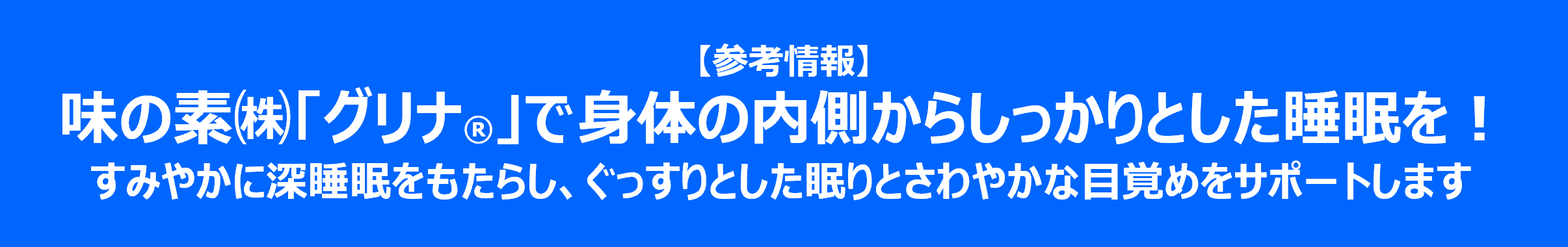 ※1:睡眠アミノ酸“グリシン”は非必須アミノ酸の一種で、体内で作りだすことができるアミノ酸です。私たちが普段食べている食品にも広く含まれ、特にホタテなどの魚介類に多く含まれています。