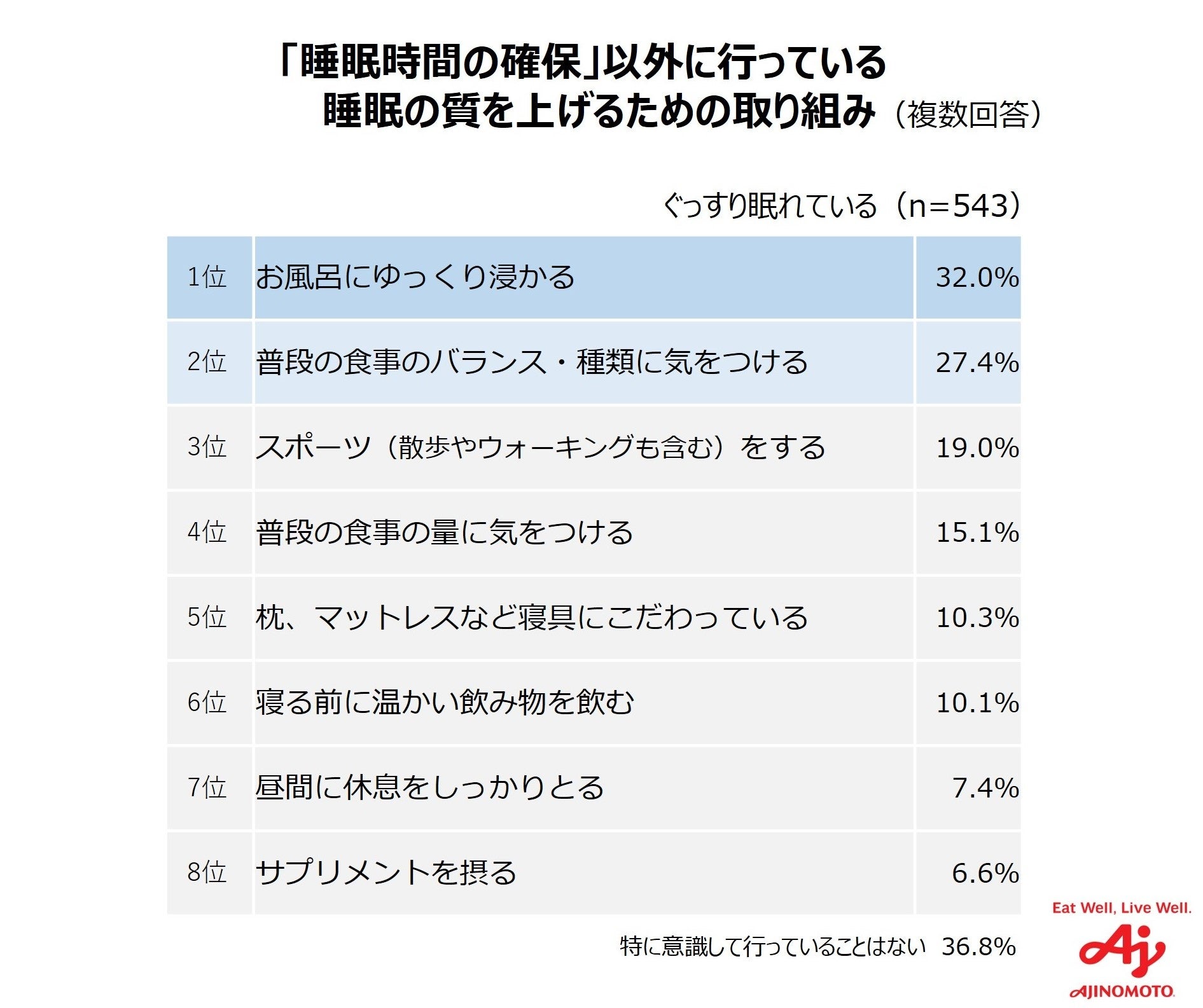 「日頃、ぐっすり眠れている」と回答した6割(63.2%)が「睡眠時間の確保」以外に睡眠の質を上げるための取り組みを実施していることが分かりました。「お風呂にゆっくり浸かる」が32.0%と一番多く、次いで「普段の食事バランス・種類に気を付ける」が27.4%、「スポーツ(散歩やウォーキングも含む)をする」が19.0%の結果となりました。三橋先生は、「日頃からぐっすり眠れていると実感できている人たちは、睡眠時間の確保だけでなく、しっかりと睡眠の質に向き合った活動ができていることで、睡眠と人生の満足度が高まっているのだと思います」とコメントしました。