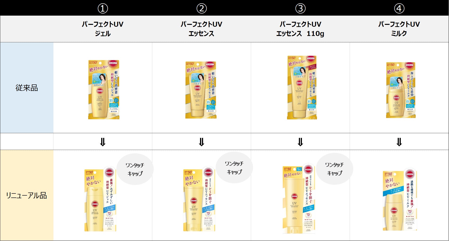 汗・水・こすれに強い持続型「パーフェクトシリーズ」の①化粧水感覚でみずみずしいアクアリィジェル②日やけによるシミも予防できるアクアリィエッセンス③たっぷり使えるアクアリィエッセンス110g大容量サイズ④過酷な環境にも強い2層タイプのスムースミルクの3品目4品種の外装パッケージを従来のブリスター台紙タイプから、シュリンク台紙タイプに変更することで、プラスチックの使用量を90%以上削減し、地球環境に配慮したパッケージへリニューアルしました。