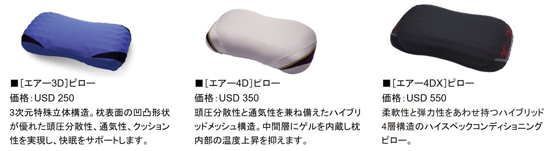 [エアー]のUSオンラインストアでは、最新の睡眠科学を取り入れた[エアー]シリーズの中から現地のニーズに合わせてアイテムを厳選し、マットレスは点で支えて質の高い睡眠へと導く特殊立体クロススリット構造の[エアーSI]マットレスをアメリカの標準に合わせたサイズで展開します。まくらは機能が異なる3種類、持ち運び用シリーズ[エアーポータブル]からはクッション3種類を揃えます。