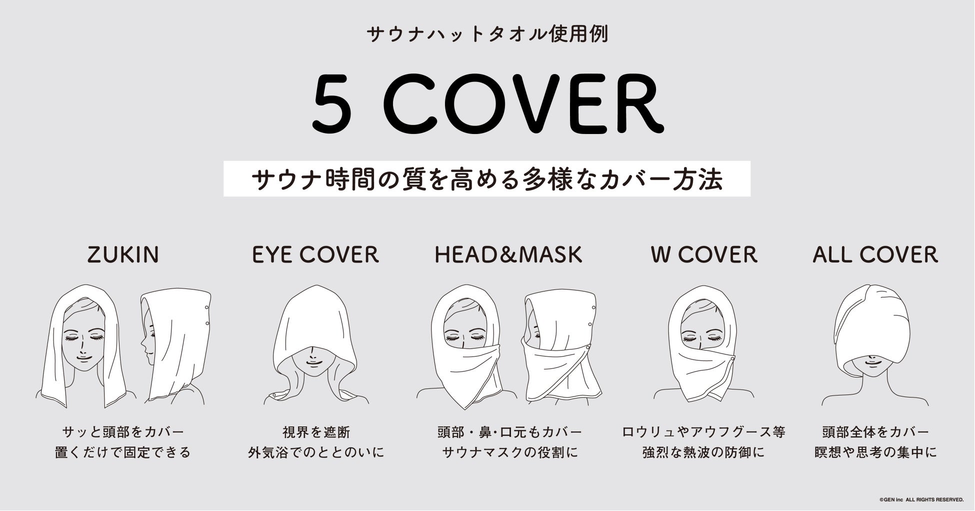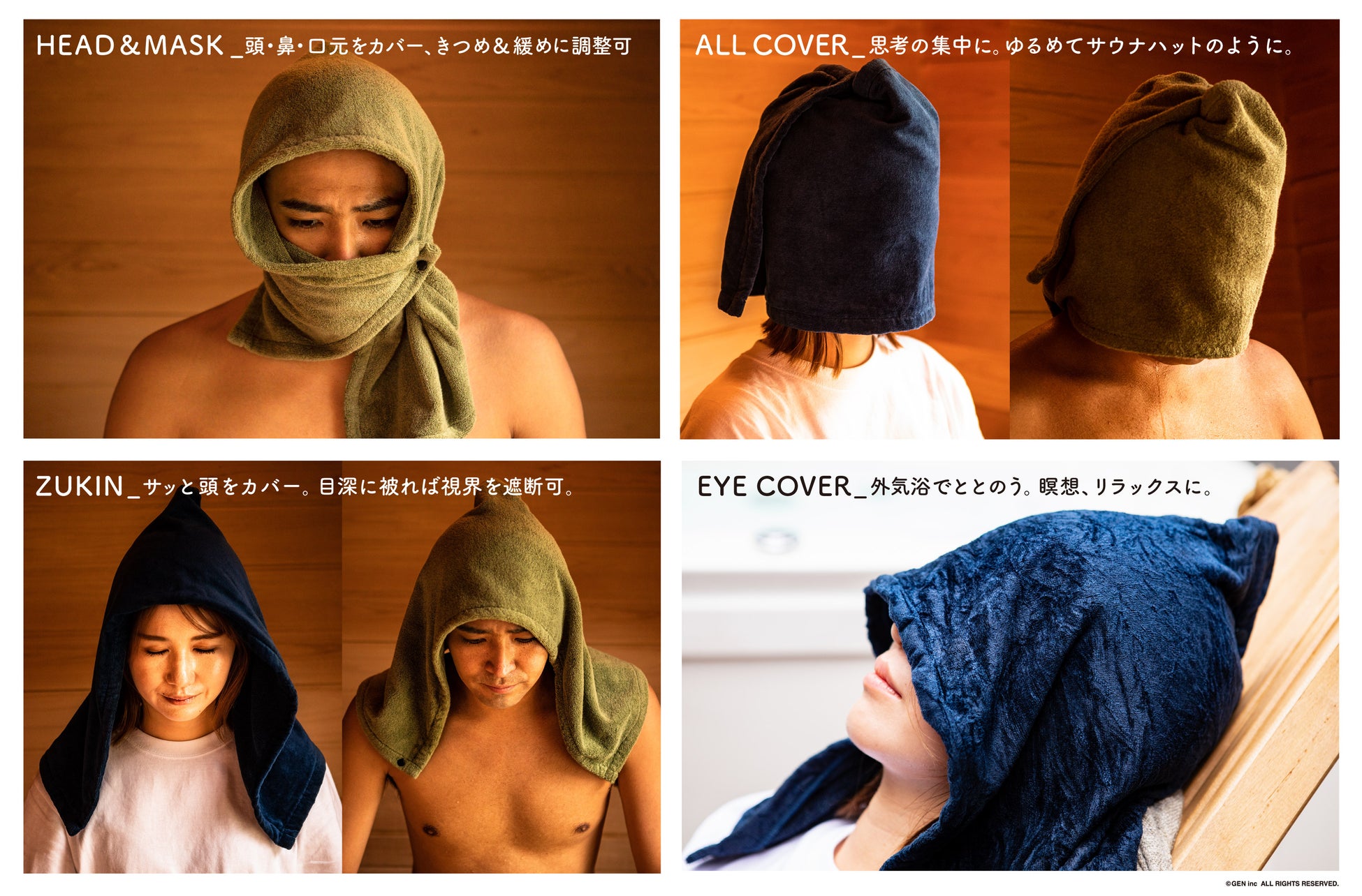 入浴時の必需品であるタオルに「カバーする」という概念を取り込み、快適なサウナ体験を追求して作られた「サウナハットタオル」。サウナシーンや体拭きやすさなどを考慮して設計されたサイズのタオルに、熱くなりすぎない素材の7つのボタンが設置されています。ボタンの留め方ひとつで、頭や髪を熱から守るサウナハット、サウナ室での息苦しさを大幅に低減するサウナマスク、外気浴での瞑想やリラックスに使えるアイカバーなど5つのパターンに早変わり。これ1枚で入浴、サウナ、外気浴とワンランク上のサウナ体験を楽しめます。