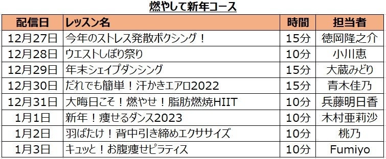 疲れた心身をリラックスさせる「癒して新年」コースと、しっかりトレーニングを行う「燃やして新年」コース、2つのコースをご用意。それぞれ8種類ずつの特別プログラムを、会員登録なしで、どなたでも無料で受講いただくことができます。