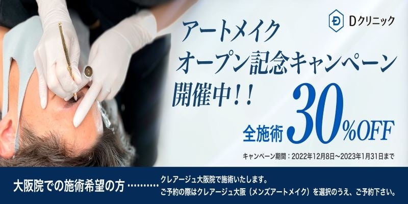 Dクリニック(札幌/東京/新宿/名古屋/大阪/福岡)は、男性専門の美容メニューを展開するDクリニック東京 PLUSの人気施術メニュー「メンズアートメイク」を全国のDクリニック(札幌/新宿/名古屋/大阪/福岡)でも開始し、2022年12月8日(木)~2023年1月31日(火)までの期間限定でオープン記念キャンペーンを実施いたします。