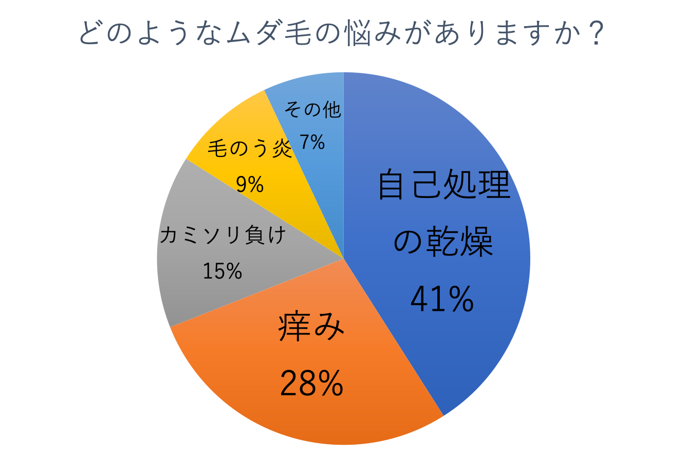 冬のムダ毛ケアによるトラブルについての回答は、ほぼ全てが自己処理により発生したトラブルであるという結果となりました。多くの方が使用している剃刀やシェーバーで自己処理をおこなうと、お肌の表面が削れてしまい皮脂が過剰に剥がれ落ちてしまう現象が起き、その結果乾燥やかゆみ、剃刀負けなどの症状が発生してしまいます。皮脂の役割として、肌中の水分が蒸発していくことを防ぎ、外的要因からのバリア機能があるため、皮脂が削られてしまうと乾燥肌やインナードライ、様々な肌トラブルを引き起こす可能性があります。