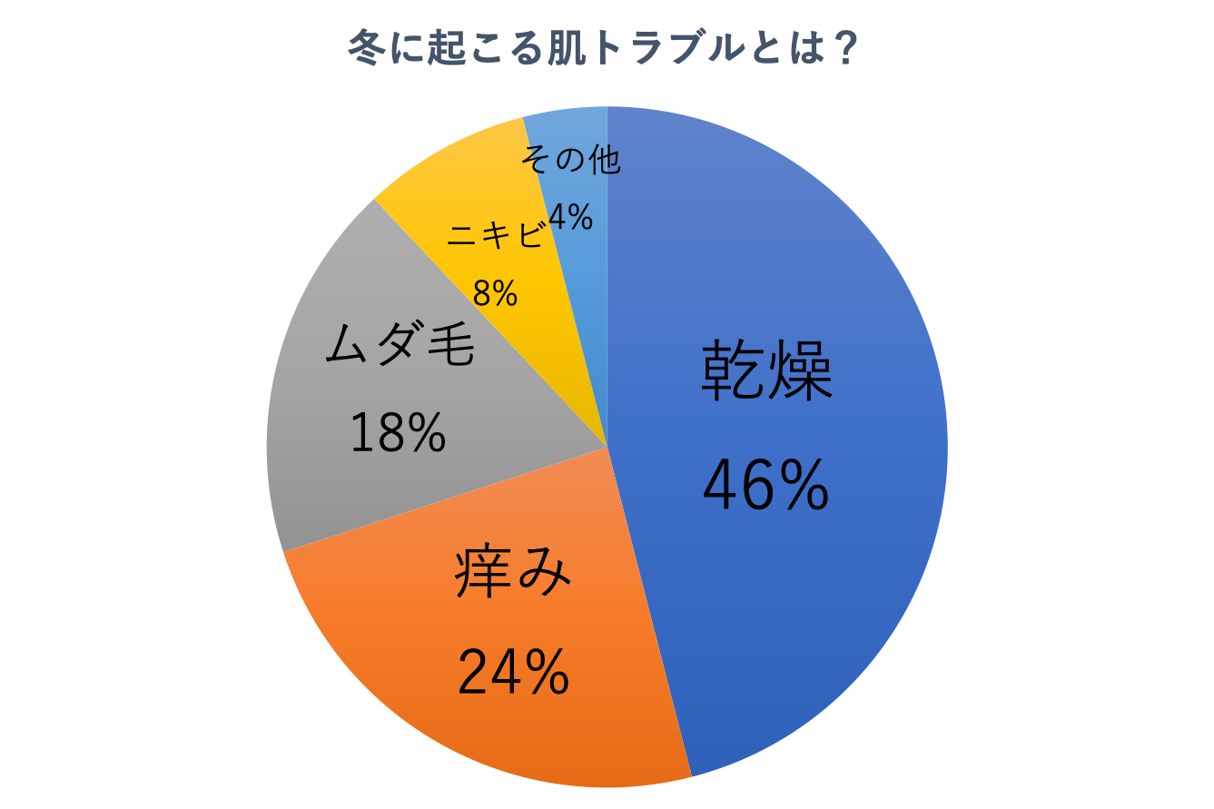 という結果になりました。冬は空気が乾燥する為お顔や体の肌バリアが弱くなり、1位は乾燥、2位は乾燥を伴う痒みという回答が挙がりました。気になったのは3位の『ムダ毛』。肌の露出が少ない冬でも、意外と見られていたり気になるムダ毛が肌悩みの上位にランクインしました。4位はニキビということで、乾燥によるインナードライが起きることで、皮脂が過剰分泌されニキビができてしまうという結果でした。