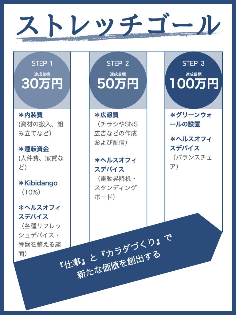 OPENに先駆け、クラウドファンディングサイド「Kibidango」にて支援受付を開始いたします。支援期間は2022年12月18日(日)20:00〜2023年1月31日(火)23:59で、300,000円の支援金を目指します。皆さまと健康空間を共創できますと幸いです。