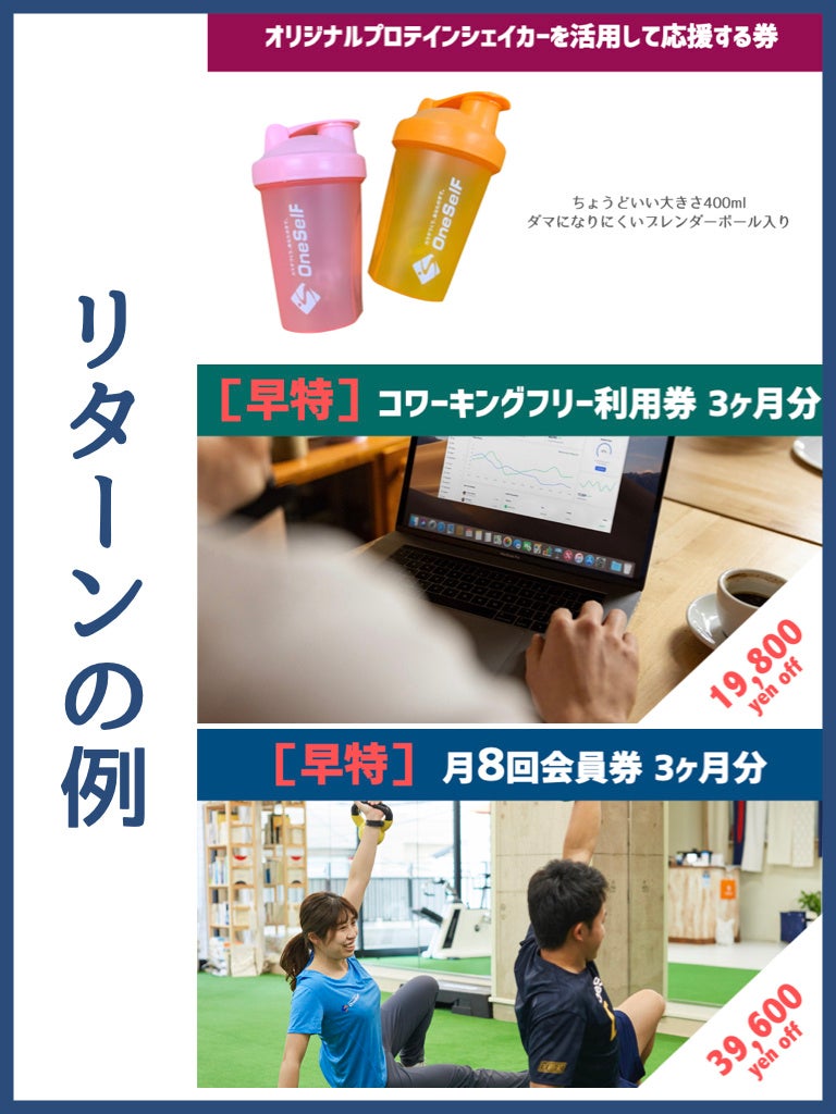 ご支援へのリターンとして、20-35%OFFのトレーニングご利用券やコワーキングご利用券などに加え、実際にOneSelFで使用しているオリジナルプロテインシェイカーやオリジナルタオルなどもご用意しております。