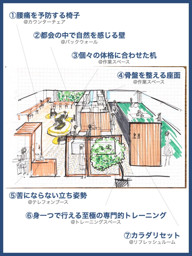 こうした社会的な課題に対し、働く=不健康のイメージを払拭し働けば働くほど健康になる空間として、この度、コワーキングスペースとセルフパーソナルトレーニング™️が併設した施設を開設し、スポーツ医科学の知見からシゴトとカラダ、双方のパフォーマンスを向上する空間を創造していきます。