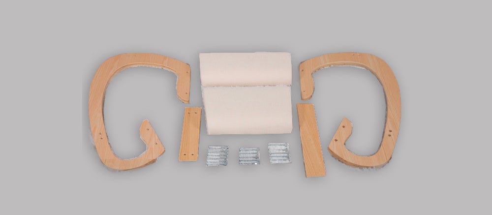 バーチ木材、生地(コットンリネン)、スポンジ、金属パーツ